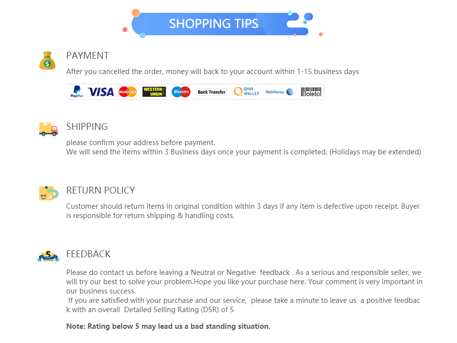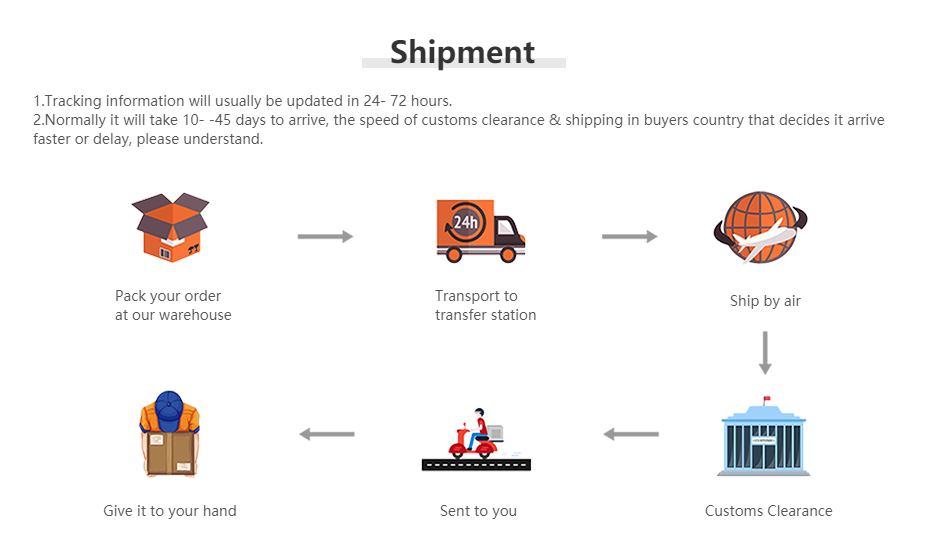 A11: O horário de chegada está relacionado ao meio de transporte.Você pode escolher o melhor meio de transporte ao fazer um pedido.Se não tiver certeza, você pode consultar nossa equipe de atendimento ao cliente.Em geral, pode atingir 80% do mundo em 8 a 20 dias.Se você não receber suas mercadorias dentro de 60 dias, podemos presumir que as mercadorias foram perdidas e reembolsaremos você integralmente.