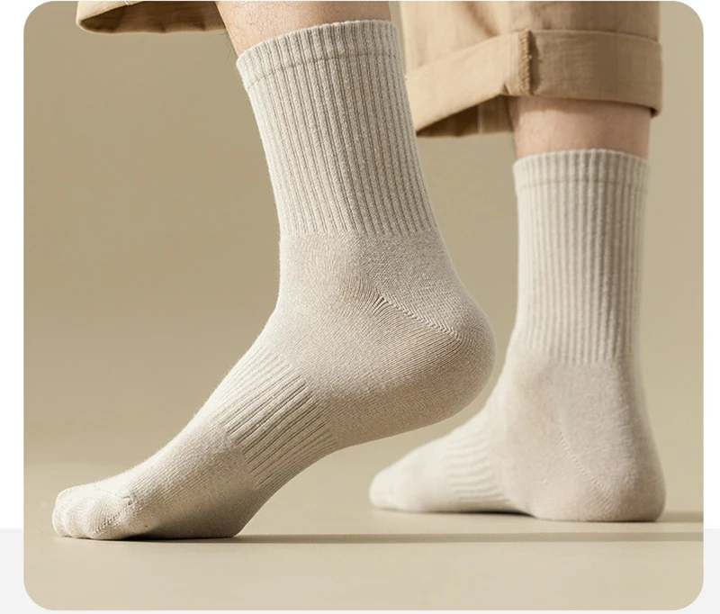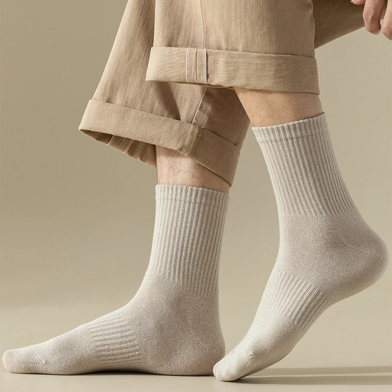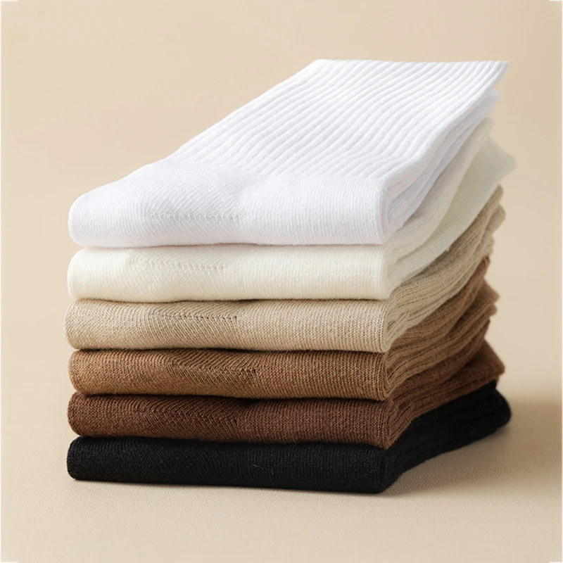 Meias masculinas retro cor sólida café branco cáqui bege respirável meias de algodão casual esporte na moda tubo médio longo meia